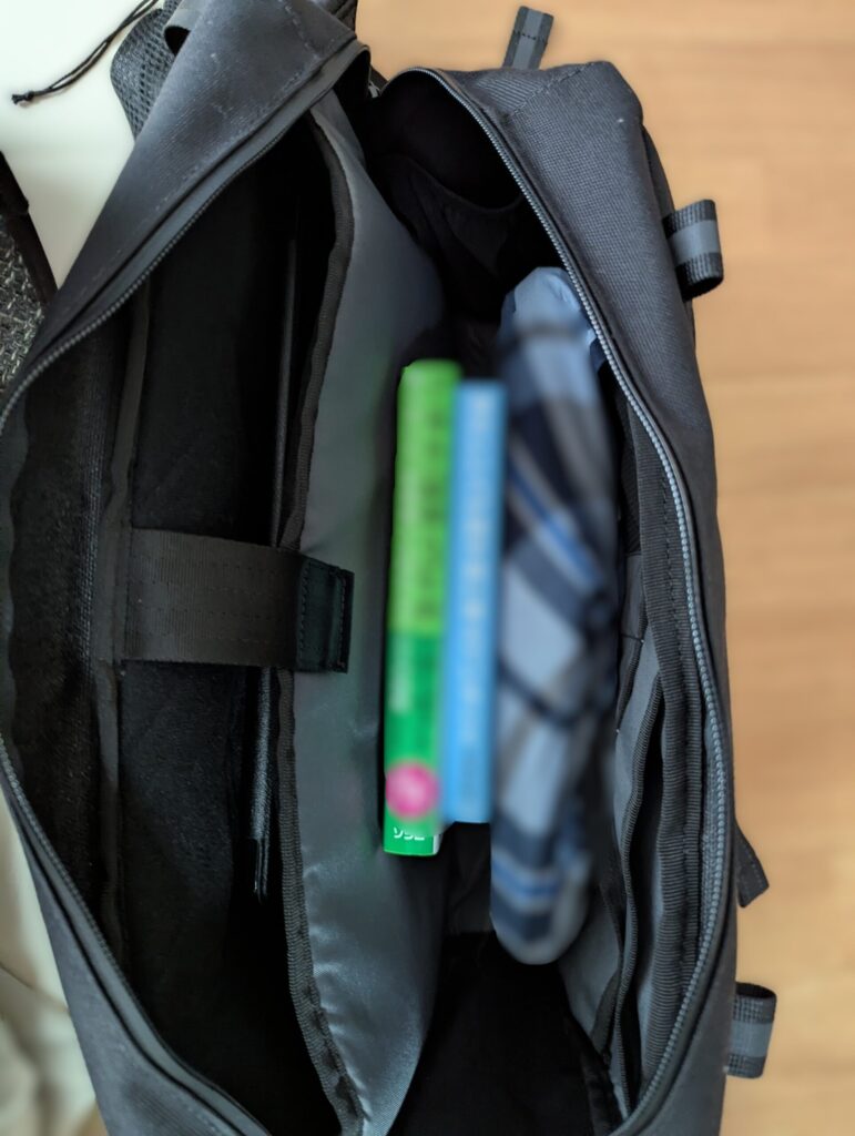 - 厚めのビジネス書2冊、メカニカルキーボード、12.1インチタブレットがちょうど入る最適なマチ幅